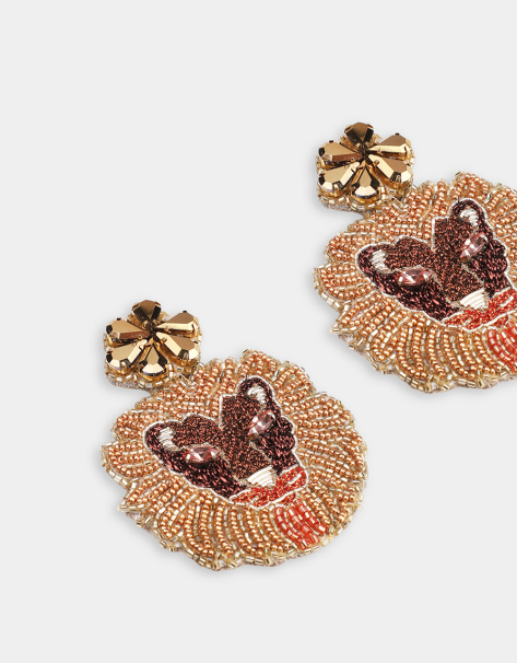 Hand embroidered, this gold Lion Brooch adds to a jacket or a simple blouse.