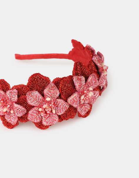 Maxi Noto earrings in pink / red are hand-embroidered with lurex thread, glass beads, and heart-shaped crystals bordered with sequins, combining different textures to evoke the splendor of Noto, a magnificent Baroque town in southern Sicily.