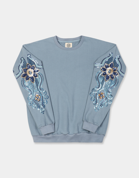This season's new arrival : the denim blue Palm Tree sweatshirt, featuring embroidered palm trees on the front. Wear it like a piece of jewelry.