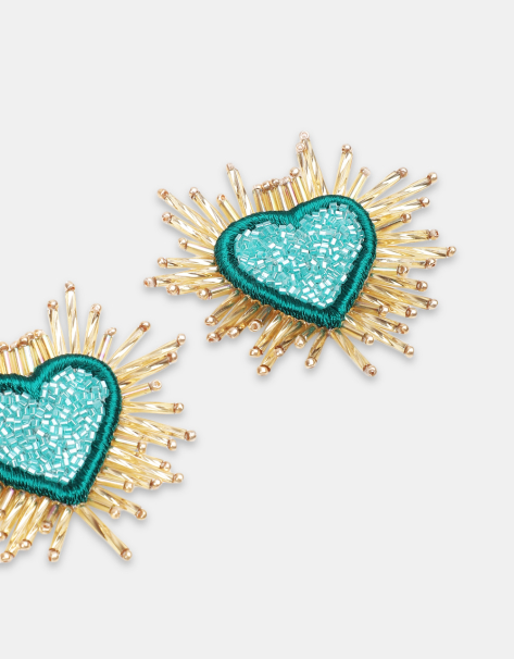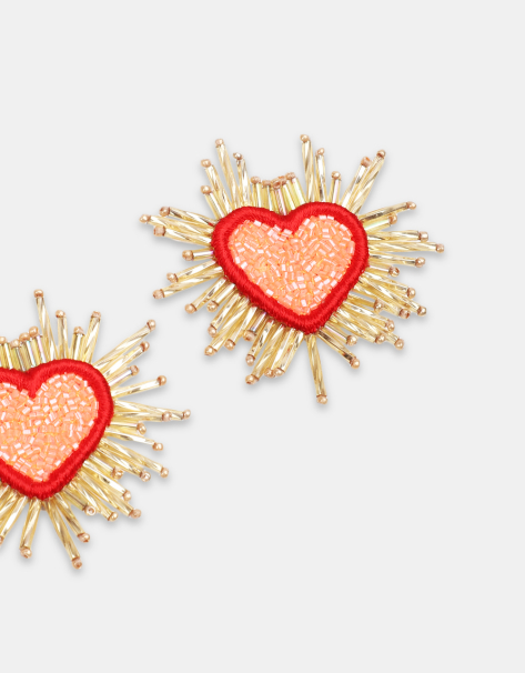 Hand embroidered pink Heart Earrings. Inspired by the sacred heart imagery found from Sicily to Mexico, these statement earrings will add sparkles to your outfit.