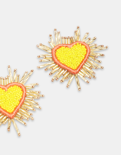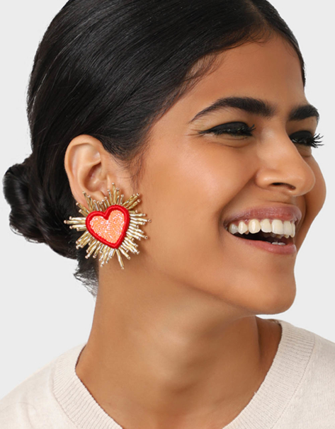 The model is wearing the Orange Sparkle Heart Beaded Earrings.
