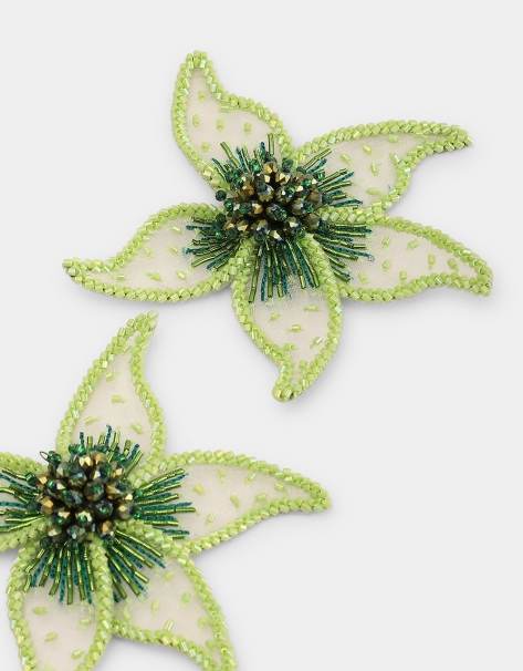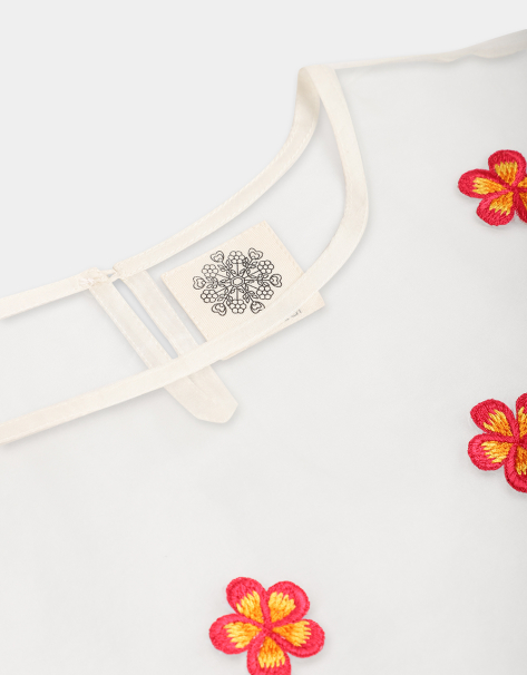 The Tropical white-green organza T-shirt, perfect for summer, is entirely hand-embroidered with beads on silk organza. It can be worn with a neutral bra, a strapless top, or overalls.